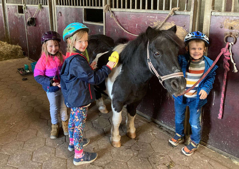 Seit diesem Jahr ist auch das Shetlandpony „Moritz“ mit Julia Schlechte dabei. Die Idee, Kinder durch den Kontakt mit dem Pferd zu fördern, ist vor einigen Jahren entstanden: „Es ist beachtlich, was sich die Kleinen zutrauen, gerade im Umgang mit dem großen Pferd“ so die Kindergartenleiterin Katrin Röhling. Die Kinder bekommen hier die Möglichkeit, spielerisch mit dem Pferd Kontakt aufzunehmen und Verantwortung für ihren Partner zu übernehmen. Dazu gehören auch Verhaltensregeln, Fütterung, Pflege und das Führen der Pferde. Bevor die Kinder sich wieder auf dem Rückweg zum Kindergarten machen, bekommen „Henry“ und „Moritz“, ihr verdientes Lob, Streicheleinheiten und ein Leckerli.