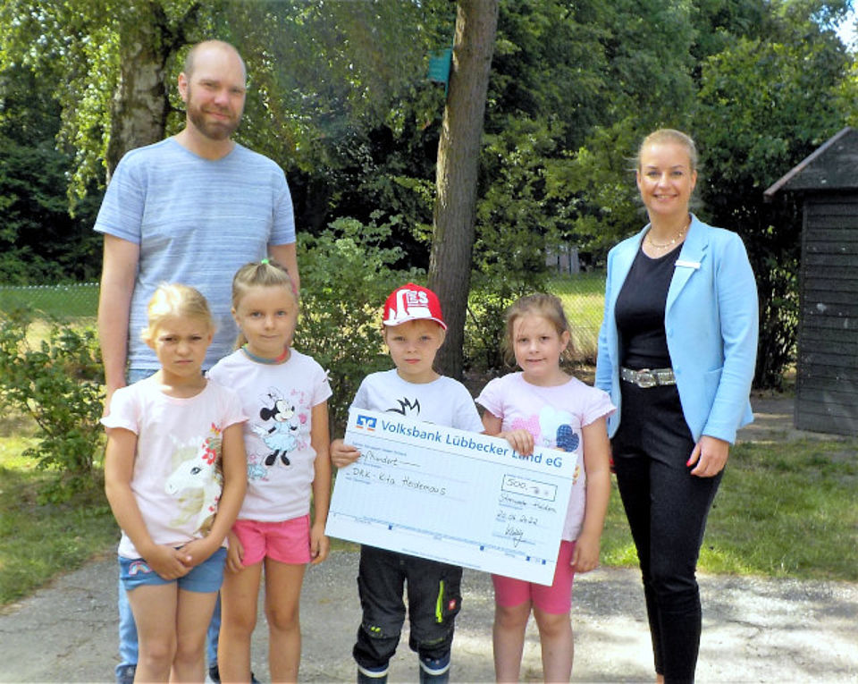 Grund zur Freude in der DRK-Kita „Heidemaus“ in Haldem: Anna-Karina Köchy, Geschäftsstellenleiterin der Filiale Haldem der Volksbank Lübbecker Land eG, besuchte die Einrichtung und hatte eine Spende in Höhe von 500,- € sowie ein Abschiedsgeschenk für die Vorschüler des „6er Clubs“, die nach den Sommerferien eingeschult werden, dabei.